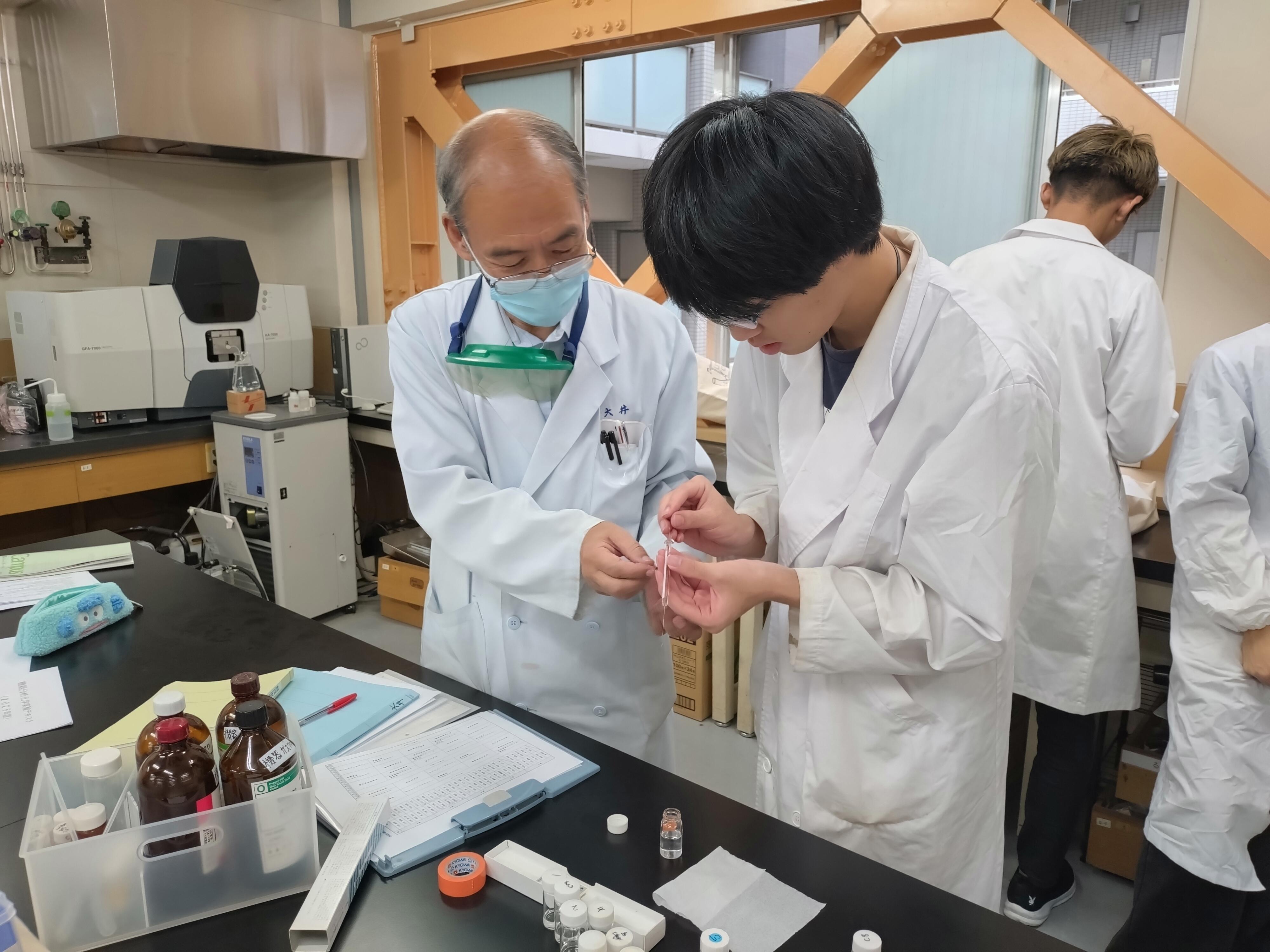非常勤講師のO先生より測定に必要な実験器具類の扱い方の指導を受けている様子。