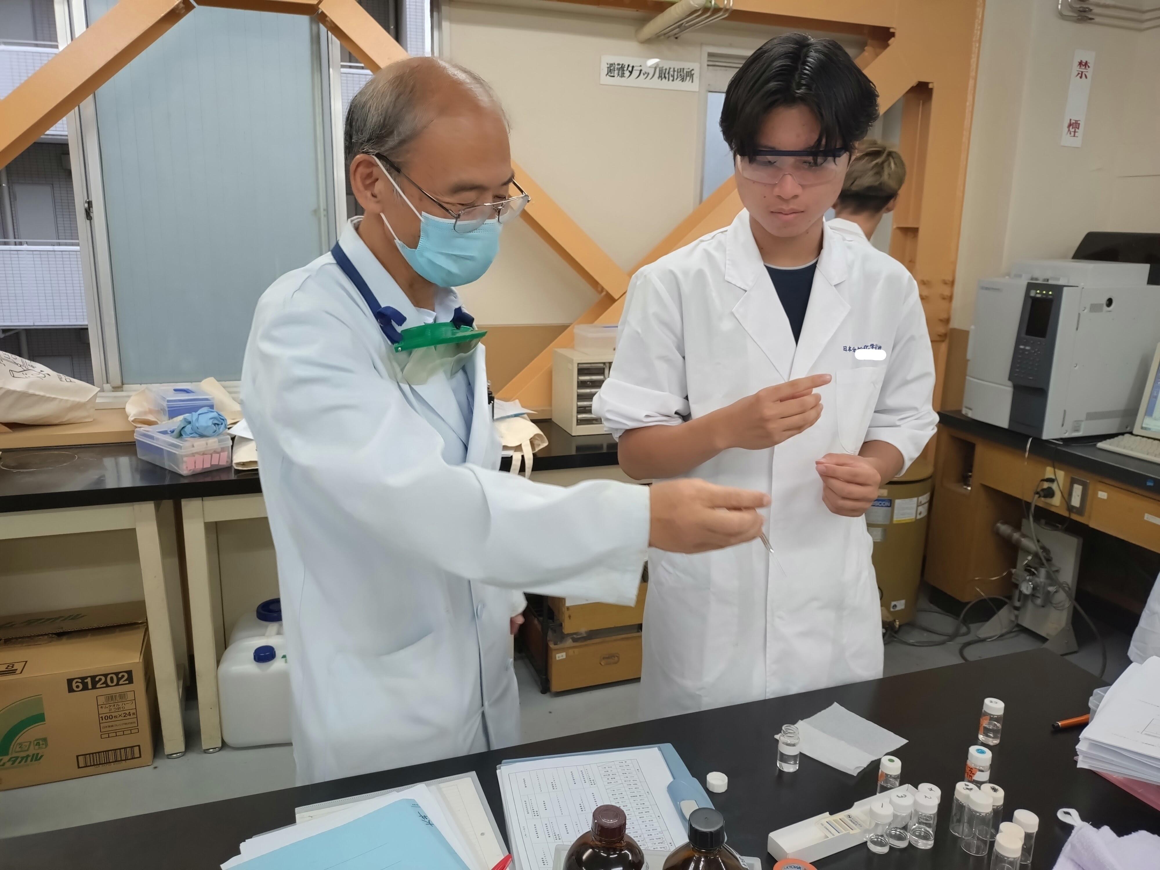 説明を学生たちは聞いているため、初めて化学を学ぶ方でも安心して実験に取り組むことができます。