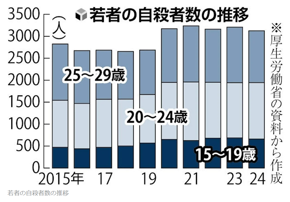 参考:自ら命絶つ15~29歳の若者が3000人超と高止まり、未遂歴も多く...「自殺対策白書」閣議決定 読売新聞 2025/10/24